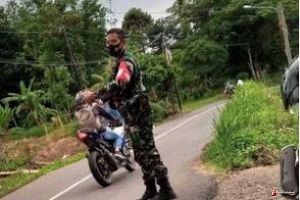 Dengan sigap Sertu Rofiudin berdiri di pinggir jalan untuk mengatur pemakai jalan agar tidak terjadi sesuatu yang tak diinginkan.