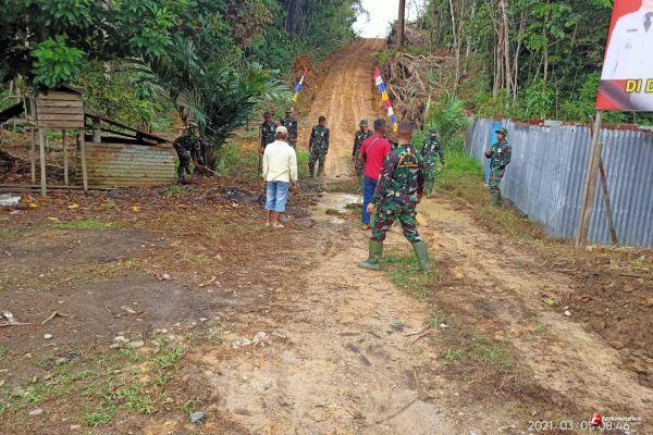 Pengkadan- Anggota TMMD bersama masyarakat terus bergotong-royong mengerjakan perbaikan jalan di Dusun Tintin Kemantan, Desa Hulu Pengkadan, kecamatan Pengkadan, kabupaten Kapuas hulu