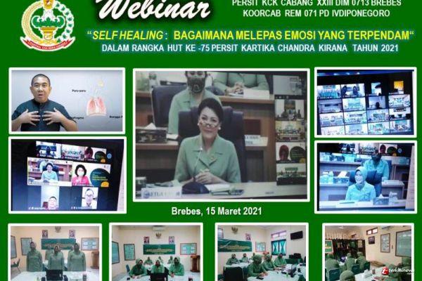 BREBES – Pengurus Persit Kartika Chandra Kirana (KCK) Cabang XXIII Kodim 0713 Brebes, mengikuti Webinar Self Healing (seminar penyembuhan diri) yang diselenggarakan secara virtual oleh Ketua Umum Persit KCK, Ny. Hetty Andika Perkasa, di Ruang Puskodal TNI-AD, Jakarta. Senin sore (15/3/2021).