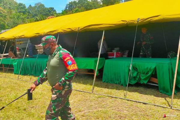 Pengkadan - Jelang kunjungan Tim Pengawasan dan Evaluasi (Wasev) TMMD Ke-110 TA 2021 dari Mabesad, Dansatgas TMMD Kodim 1206/Putussibau Letkol Inf Jemi Oktis Oil S.I.P mengecek kesiapan tenda ruang transit di Posko TMMD yang berada di Dusun Tintin Kemantan, Desa Hulu Pengkadan Kecamatan Pengkadan Kabupaten Kapuas Hulu. Senin (15/03/2021).