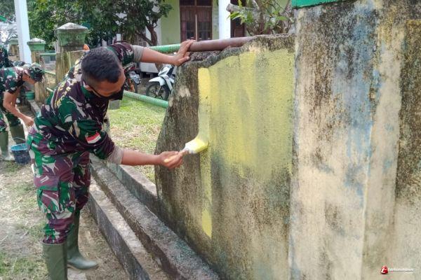 Pengkadan - Anggota Satgas TMMD Ke- 110 Kodim 12/Psb TNI Manunggal Membangun Desa (TMMD) membantu mengecat sekolahan SDN Suka Ramai di Dusun Suka Ramai, Desa Hulu Pengkadan, Kecamatan Pengkadan, Kabupaten Kapuas Hulu. Senin (15/03/2021)
