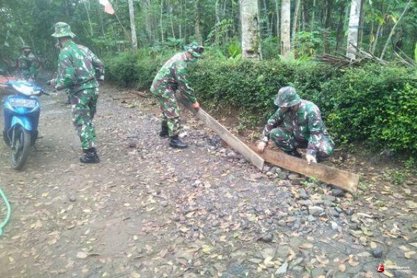 Kabupaten Semarang - Dengan membawa papan ke jalan Serda Rudi(42) dan Serda Andi(41) berusaha mencari ketebalan yang sesuai dalam penggunaan pengerjaan pengecoran jalan nantinya bersama TMMD Reguler ke-110 Kodim 0714/Salatiga, mereka memastikan papan tersebut.
