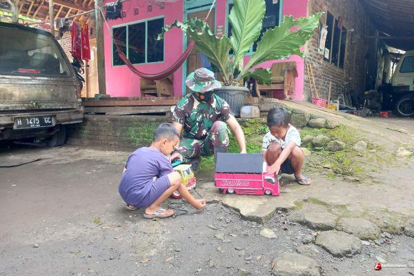 Kebersamaan itu terlihat saat Koptu Sijadin lewat di dekat langsung saja anak anak menarik tangan dan mengajaknya main bersama.