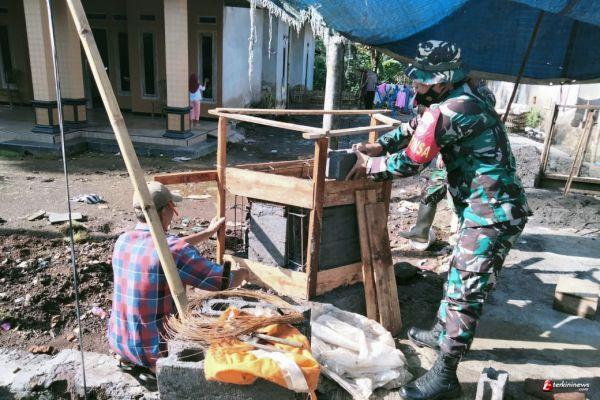Anggota Satgas TMMD Reg-110 Kodim 0714/Salatiga Serda Triyono memasang batako untuk menyiapkan pengecoran tiang depan RTLH Sumarna(60) di Desa Ketapang Kecamatan Susukan Kabupaten Semarang.