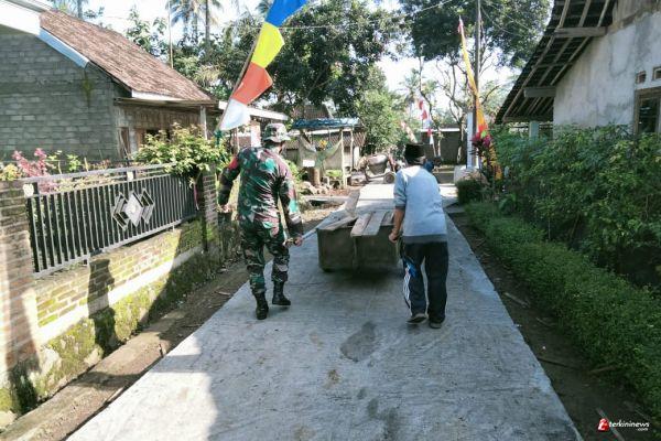 Parjo (50) bersama anggota Satgas TMMD bersama sama mengumpulkan bekas material yang sudah tidak di pakai dengan menggunakan gerobak untuk memperingan pembawaanya.