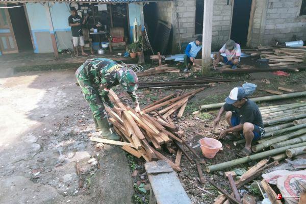 Pratu Hadi anggota Satgas TMMD terlihat sedang merapikan kayu bekas potongan yang sudah tidak di gunakan lagi untuk di manfaatkan menjadi kandang ayam.