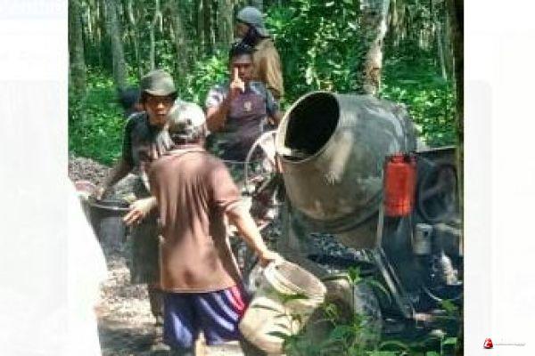 Serka Guntoro(45) salah satu anggota satgas membantu menjadi operator molen, semangat mereka semakin terlihat, saling antri memasukkan pasir juga koral ke dalam molen di tambah semen dan juga air di olah dijadikan adukan sebagai bahan untuk pengecoran jalan, takaran campuran perlu diperhatikan agar hasil yang di dapat bisa maksimal sehingga dalam pemanfaatan jadi lebih awet.
