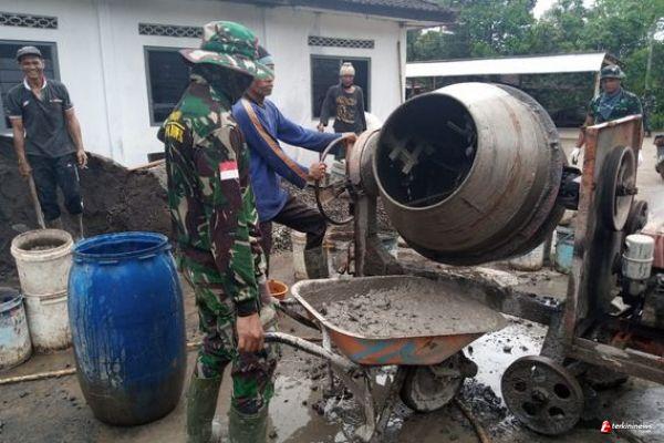 ”Untuk melangsir batu ukuran besar, batu koral, pasir maupun adukan cor beton, biasanya menggunakan ember. Namun untuk mempermudah dan mempercepat proses pengerjaaan, Angkong menjadi pilihan utama ", ungkap Sertu Ali, sambil menempatkan angkongnya di bawah molen untuk diisi adukan cor. (Pendim 0714/Salatiga).