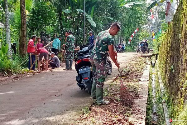 Kabupaten Semarang- Sejumlah TNI yang tergabung dalam Satgas TNI Manunggal Membangun Desa (TMMD) Reguler ke-110 Kodim 0714/Salatiga bersama warga membersihkan lingkungan agar terlihat bersih demi menunjang kesehatan.