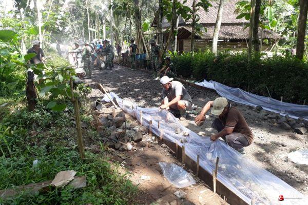 Kabupaten Semarang - Satgas TMMD Reguler ke-110 Kodim 0714/Salatiga dan warga Desa Ketapang Kecamatan Susukan Kabupaten Semarang dalam pengerjaan pengecoran jalan Program TMMD.