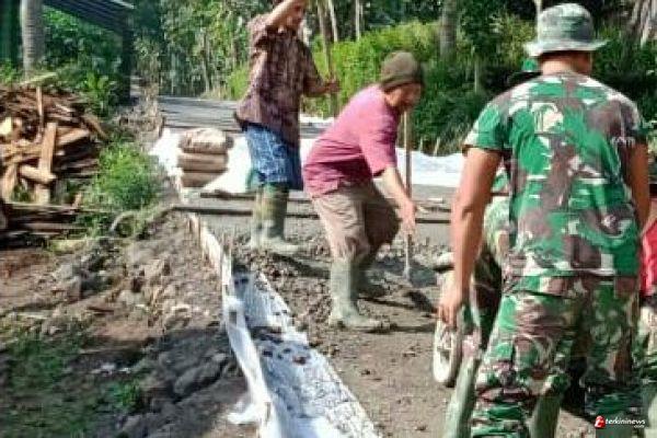 Kesibukan anggota satgas dan warga terlihat sedang menyiapkan adonan bahan pengecoran, mengangkat pasir dan pekerjaan lain yang mereka kerjakan secara gotong royong untuk mengejar target waktu yang telah direncanakan.
