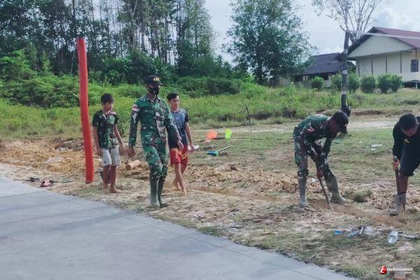 Satgas pamtas Yonif 407/PK Bersama Warga Karya Bhakti Bersihkan Lapangan Voly