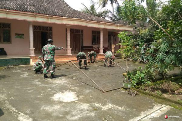 Oleh karena itu terlihat para anggota Satgas TMMD saling bergotong-royong dan kerja sama dalam mendirikan tenda tersebut.(20/02/2021)