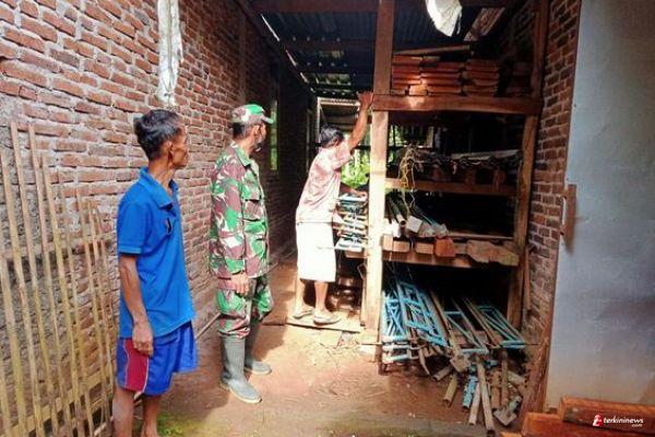 Terlihat personil satgas TMMD Peltu Susanto dan masyarakat saling bekerja sama dalam mengangkut tenda untuk di pasang.