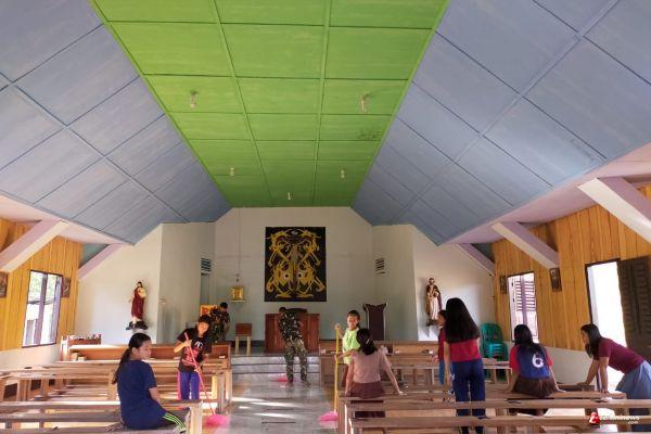 Anggota Pos Seriang Satgas Pamtas RI-MLY Yonif 407/PK, melaksanakan Karya Bhakti bersama warga membersihkan Gereja Katolik St. Yhosep Seriang yang berada di Dusun Lubuk Kadang, Desa Seriang, Kecamatan Badau, Kabupaten Kapuas Hulu, Kalbar. Sabtu (20/03/21).