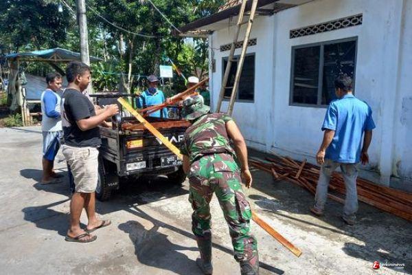 Para Satgas TMMD Reguler ke- 110 cekatan turunkan kayu dari kendaraan dan langsung diangkat ke atas untuk dipasang.
