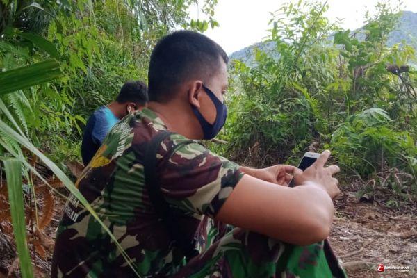 Pengkadan - Personel Satgas TMMD Reguler Perbatasan ke-110 Kodim 1206/Putussibau di Desa Hulu Pengkadan, Kecamatan Pengkadan, Kabupaten Kapuas Hulu membutuhkan perjuangan mendaki bukit untuk mencari sinyal ponsel.