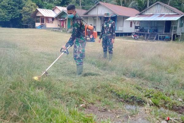 Dengan bantuan Alat mesin penebas, Prada Novri memotong rumput yang sudah mulai meninggi. Hal ini diikuti oleh anggota Satgas TMMD lainnya dan juga pemuda setempat, selain menggunakan alat mesin penebas ada juga menggunakan parang dan arit. Menurut penuturan salah satu pemuda, Heri (29), Awal mula para pemuda mulai berhenti bermain Bola Kaki dikarenakan bola yang biasa dipakainya rusak dan tak terpakai.