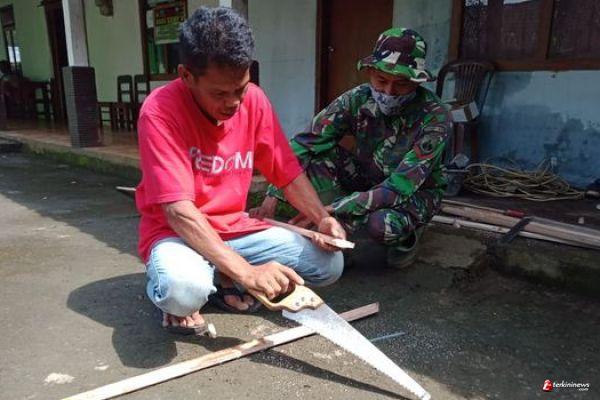Kopda Ristiawan(30) anggota TMMD dari Yonif 410 Alugoro yang tergabung dalam Anggota TMMD Reguler ke-110, bersama Warto(52) Salah satu warga desa, Kopda Ristiawan membantu membuat lis Untuk plafon Mushola AL Huda dengan sabar membantu warga dan juga dengan penuh keakrapan
