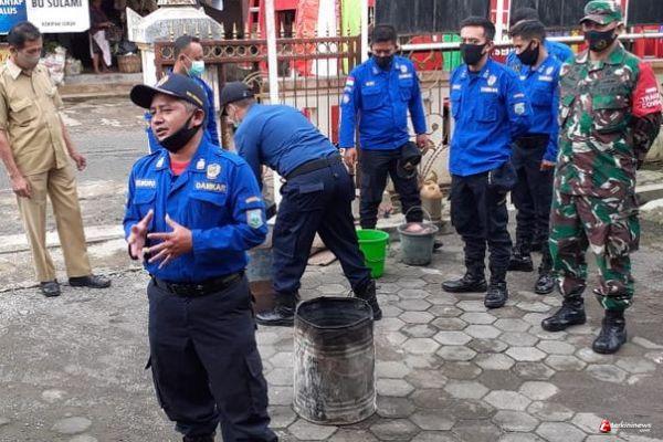 Anggota Damkar Di dampingi Sertu Sakuri Sedang Memperagakan Cara memadam kan Kebakaran,sehingga kebakaran tidak meluas
