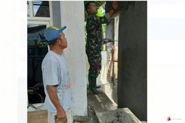 Rukhani(57) dengan gergaji potongnya di tangan, melihat Koptu Listiyono(38) sedang melanjutkan pelesteran dinding, Rukhani melanjutkan memotong papan untuk pelaksanaan perapian pelesteran, agar hasilnya rapi sehingga pengacian tinggal melanjutkan.