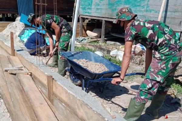 Prada Silaen dan Prada Herkulanus Anggota Satgas TMMD 110 dari Yonif RK 644/wls, kompak mengangkut material cor Pondasi Rumah Murjani (30) yang mendapat bantuan rehab rumah dari satgas TMMD ke 110 Kodim 1206/Putussibau.