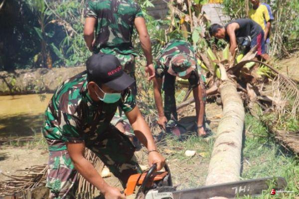 Pengkadan - Anggota satgas TNI yang tergabung dalam Satgas TNI Manunggal Membangun Desa (TMMD) ke-110 Kodim 1206/Putussibau, tidak hanya hebat dalam memegang senjata dan bertempur, namun, mereka juga mahir dalam memegang peralatan pertukangan, mesin pemotong kayu (senso), seperti menebang pohon kelapa dan memotongnya, ini di lakukan Anggota Satgas TMMD untuk membantu warga di dusun Tintin Kemantan, Desa Hulu Pengkadan, Selasa (24/03/2021).
