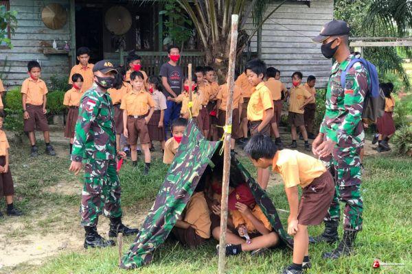 Personel Satgas Pamtas RI-MLY Yonif 407/PK melatih anak-anak Pramuka dalam mendirikan tenda, di SDN 08 Muakan yang berada di Dusun Muakan Hulu, Ds. Muakan Petinggi, Kec. Ketungau Hulu, Kab. Sintang, Kalimantan Barat. Rabu (24/03/21).