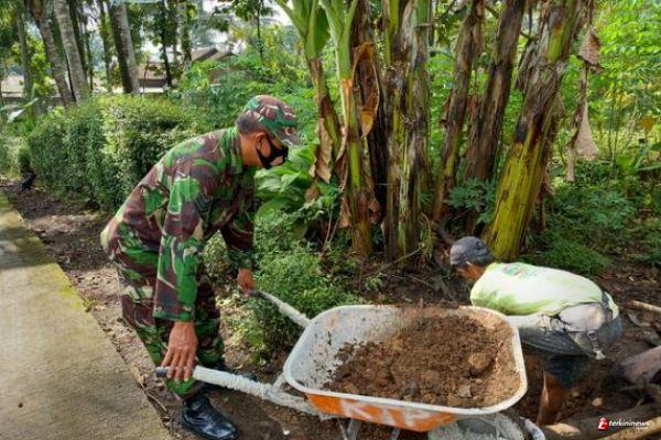 Personel Satgas TMMD, Serma Dulkolik membantu Jumadi (60) warga Dusun Karang Asem Rt 04 Rw 06 mengambil tanah untuk menimbun halaman rumahnya yang tergenang air akibat hujan lebat secara terus menerus di Desa Ketapang.