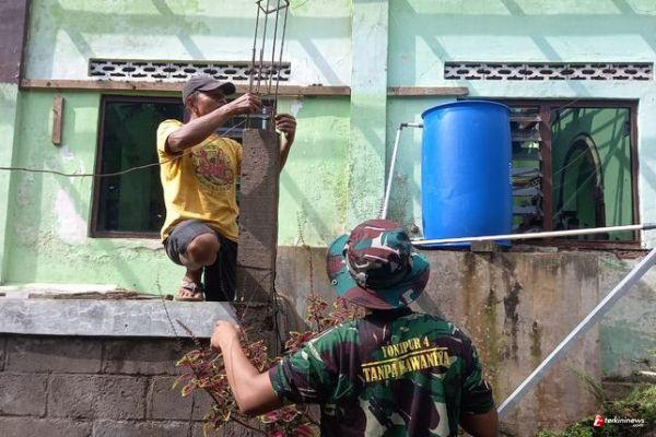 Kabupaten Semarang- Satgas TMMD Reguler ke- 110 dan Darto (45) warga Desa Ketapang Kecamatan Susukan Kabupaten Semarang seorang tukang batu saling membantu me yelesaikan Cor buat teras Musholla Al-Huda,Rabu (24/03/2021)
