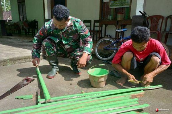 Personel Satgas TMMD Kodim 0714/Salatiga Koptu Listiyono bersama warga marwan ( 47) melakukan pengecatan kayu reng/lis untuk dipasang di Musholla Al Huda biar kelihan rapi.