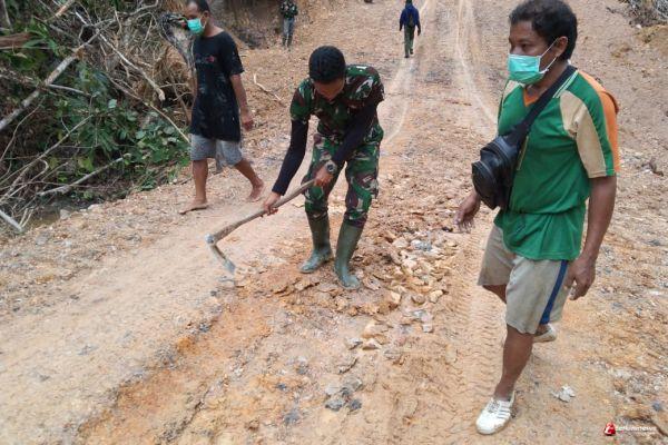 Pengkadan - anggota Satgas TMMD 110 di Desa Beringin mengajak warga bergotong royong melaksanakan penimbunan jalan yang terlihat berlubang di beberapa titik jalan di Desa Beringin Kecamatan Pengkadan , Kabupaten Kapuas hulu.