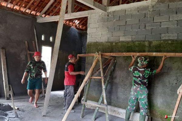 Kab Semarang- Koptu Sulistyo anggota Satgas TMMD ini langsung inisiatif merangkai kayu dan bambu buat tangga sederhana untuk memudahkan pemasangan plafon rumah Munawir Rt 02/04 Dusun Sarimulyo Desa Ketapang Kecamatan Susukan, Kamis (25/03/2021).