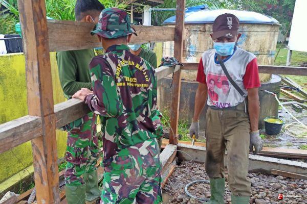 Pengkadan-Nampak Mayarakat bersama Satgas TMMD 110 Putussibau dengan di bantu mengerjakan Fasilitas tempat wudhu yang menjadi Sasaran tambahan fisik di lokasi TMMD Dusun Suka Ramai, Desa Hulu Pengkadan, Kecamatan Pengkadan, Kabupaten Kapuas Hulu,Jumat 26 Maret 2021.