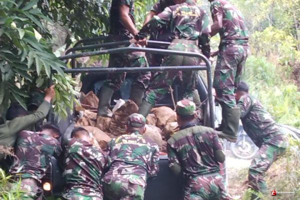 Pengkadan-Terlihat Satgas TMMD 110 Putussibau dengan di bantu warga Mendorong Mobil Penggangkut Material Batu dari bibir sungai Hulu Pengkadan dalam mengerjakan Fasilitas tempat wudhu yang menjadi Sasaran tambahan fisik di lokasi TMMD Dusun Suka Ramai, Desa Hulu Pengkadan, Kecamatan Pengkadan, Kabupaten Kapuas Hulu,Jumat 26 Maret 2021.