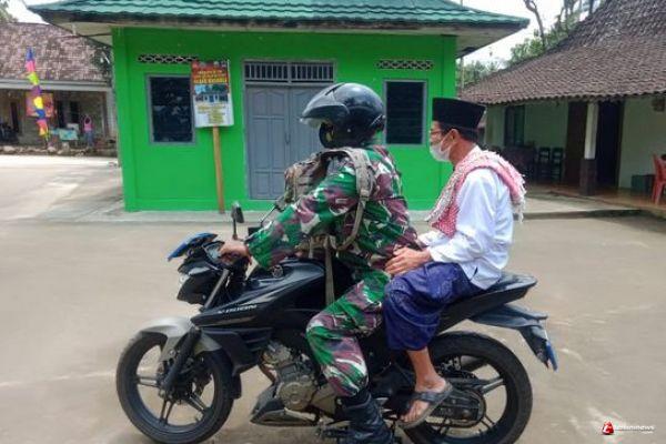 Tampak Sertu Khundori(43), salah satu anggota Satgas TMMD memboncengkan Bapak Ustajab(55) salah satu tokoh agama disekitar lokasi TMMD tersebut.