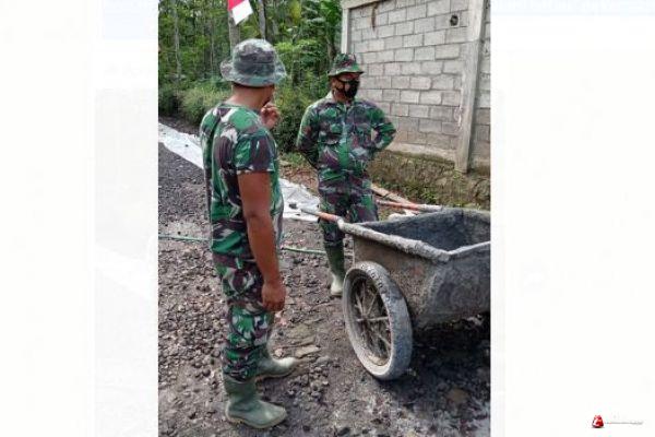 Terlihat di lokasi pengecoran, Kopda Nanang dan Praka Ari, sedang mengantri bersama dengan gerobaknya untuk menanti adukan cor untuk pengecoran jalan.