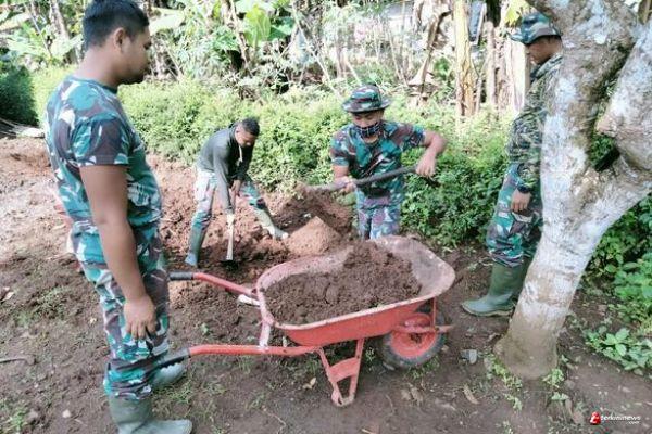 Kebersamaan untuk melakukan penimbunan RTLH ini terlihat saat Praka Riki bersama anggota satgas yang lain dan di bantu warga bersama-sama sedang menggali tanah untuk menimbun lantai rumah Sumarna, jumat (26/3/21)
