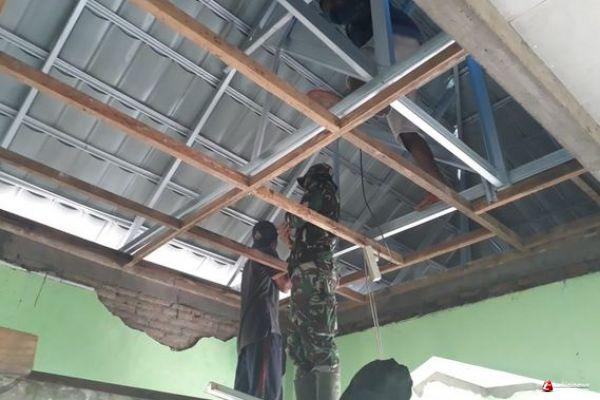 Renovasi Musholla Al-Huda sudah Tahap pemasangan rangka plafon , mengerjakan harus yang Ahlinya Karena dengan pemasangan penuh ketelitian . sehingga saat di pasang bisa siku posisinya dan terlihat rapi . Musholla Al-Huda yang sedang dibangun oleh Satgas TMMD bersama warga samsul hadi (40) warga desa ketapang tampak sedang merapikan rangka plafon tersebut.