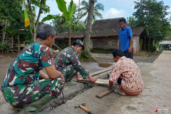 Kabupaten Semarang- Personel TMMD Peltu Edi bersama salah satu personil Koptu Ari membantu warga tutup selokan supaya tidak menggangu aktifitas warga Dusun Sari Mulyo berkendaraan.