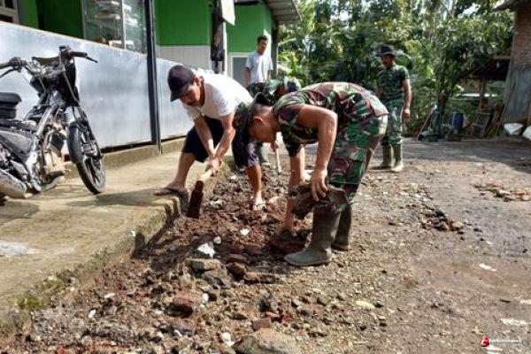 ” Sertu Ansori sedang memindahkan batu-batu kecil dibantu Sarminto(37), mereka sudah saling mengenal karena sudah hampir 4 pekan bersama-sama bekerja jadi semakin erat dan kompak.