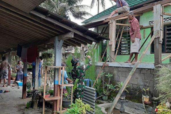 Suparno, warga Dusun Sarimulyo, langsung memanjat ke atas sembari berbincang dengan Serka Ali Meminta bantuan untuk mengangkat asbes dan di ulurkan keatas.