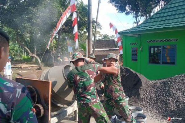 Semangat yang luar biasa yang ditunjukan oleh anggota Satgas TMMD saat melanjutkan pekerjaan menyelesaikan sasaran fisik, pengecoran jalan di Dusun Sarimulyo Rt 04 Rw 02 Desa Ketapang, Kecamatan Susukan, Kabupaten Semarang.