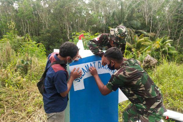 Pengkadan-Terlihat Anggota Satgas TMMD 110 Putussibau sedang melukis nama Desa dan batas Desa Hulu Pengkadan dengan Desa Riam Panjang ,Tuga batas Desa di sasaran TMMD menjadi pekerjaan Fisik dengan sasaran berbeda dalam wujud kepedulian dan antisipasi permasalahan sosial tentang batas Desa Hulu Pengkadan Kecamatan Pengkadan dengan Desa Riam PanjangKecamatan Pengkadan Kabupaten Kapuas Hulu,Minggu 29/3/2021.