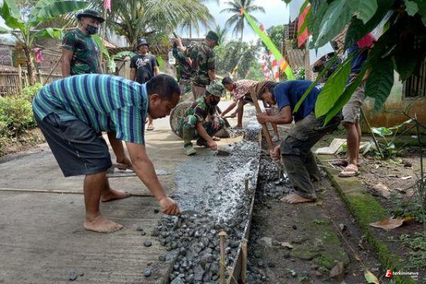 Kabupaten Semarang - Personel TNI yang tergabung dalam Satgas TMMD ke-110 Kodim 0714/Salatiga bersama dengan warga secara bergotong-royong melaksanakan pengecoran di bahu jalan.