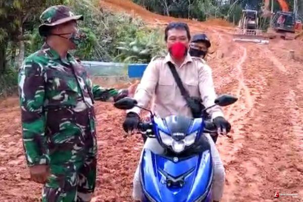 Pengkadan -Terlihat Kades Beringin melintasi jalan penghubung atar Desa Beringin dengan Desa Hulu Pengkadan yang menjadi sasaran utama TNI Manunggal Membangun Desa ke 110 Kodim 1206/Putussibau,merasakan manfaat dari bangunan jalan tersebut lebih dekat apabila ke putussibau,walaupun masih dalam tahap pengerjaan finising,Selasa 30/3/2021.