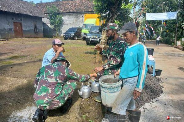 Kabupaten Semarang – Satgas TMMD dan warga melakukan ngopi dan ngeteh bareng sebelum bekerja menyelesaikan pengecoran jalan Dusun Karang asem Rt 04 Rw 06 Desa Ketapang Kecamatan Susukan, Selasa (30/03/2021).