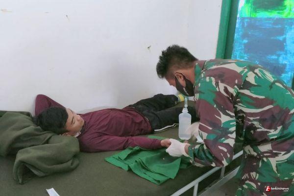 Setelah menerima kedatangan Rino, Tim Kesehatan Pos Kantuk Asam Pratu Boby dan Prada Leo memberikan penanganan medis dengan membersihkan luka, dilanjutkan menyuntikkan obat bius guna tindakan penutupan luka dengan cara menjahitnya.