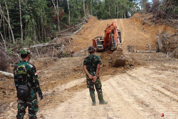 Personil satgas TMMD melakukan pengawasan kinerja alat berat pembuatan jalan, yang berlokasi di Dusun Tintin Kemantan, Desa Hulu Pengkadan, Kecamatan Pengkadan, Kabupaten Kapuas Hulu, Provinsi Kalimantan Barat.