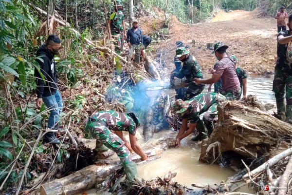 Menjelang berakhirnya program TMMD 110 Kodim 1206/Putussibau, sejumlah anggota Satgas TMMD bersama warga masyarakat, tampak begitu guyub melakukan pembersihan jalan yang baru selesai dibangun melalui kegiatan TMMD tersebut.